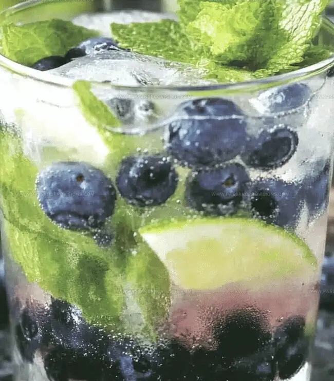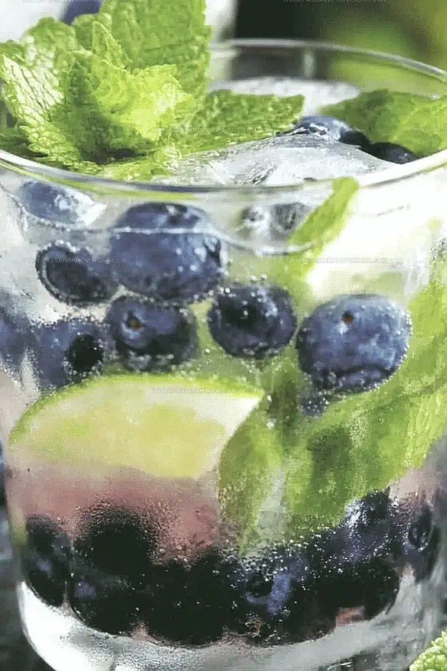 Top off the mojito with a splash of club soda for some bubbly excitement. Garnish with a fresh mint sprig and a few whole blueberries for a stunning presentation.