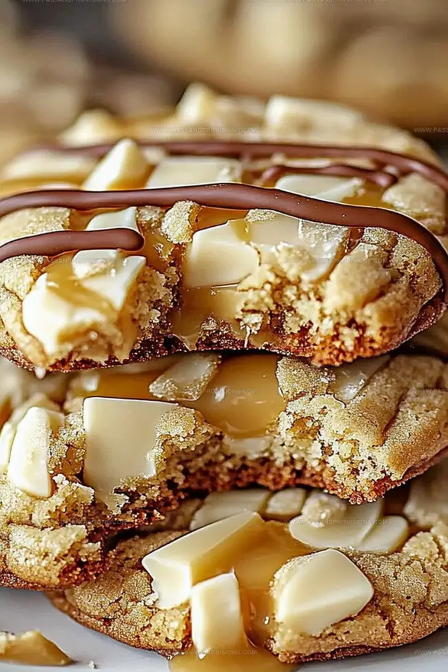 Soft, buttery cookies melt with white chocolate caramel drizzle in this irresistible sweet treat that promises pure indulgence.