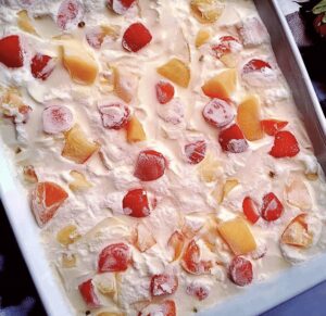 Tenderly introduce the chopped frozen fruits into the creamy landscape, creating a vibrant medley. Enhance the texture with a sprinkle of chopped nuts, shredded coconut, and playful mini marshmallows.