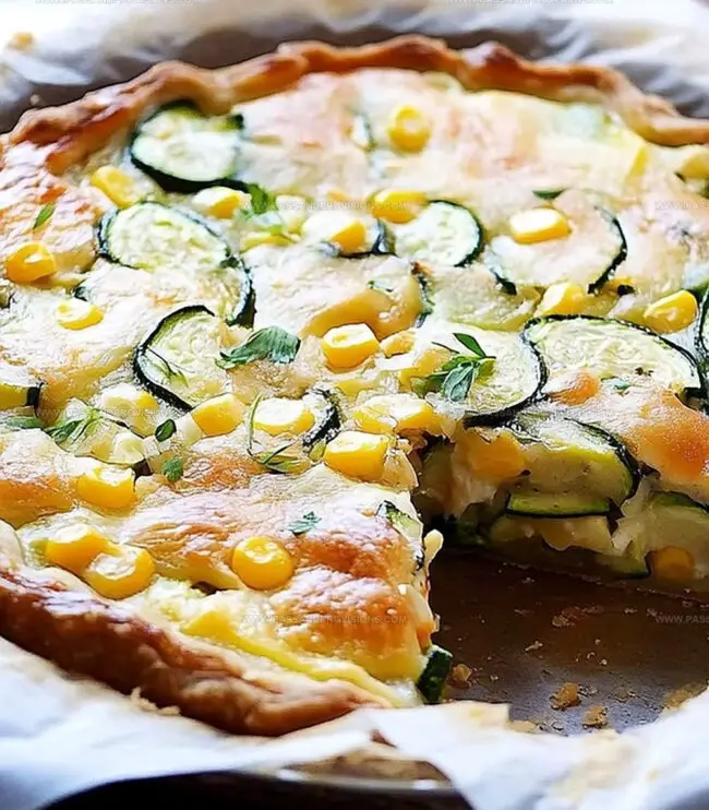 The golden crust cradles a rich, creamy filling packed with tender zucchini and sweet corn kernels.