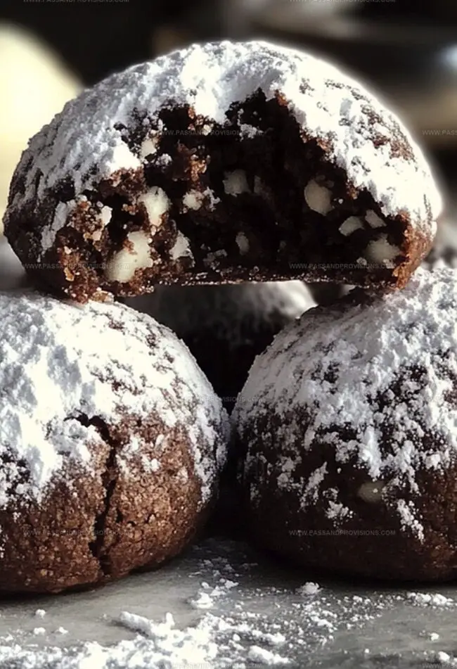 Powdered sugar blankets each round morsel like fresh fallen snow, creating a stunning visual contrast against the dark chocolate crumbs.
