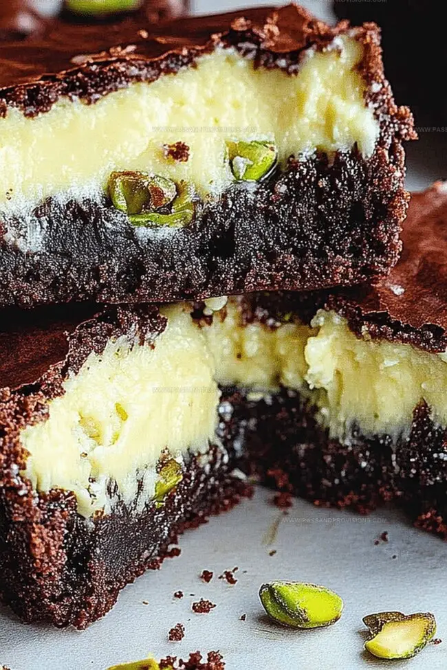 The brownies have a rich, fudgy base with a creamy cheesecake layer and a nutty pistachio twist, creating a decadent and moist dessert that melts in your mouth.