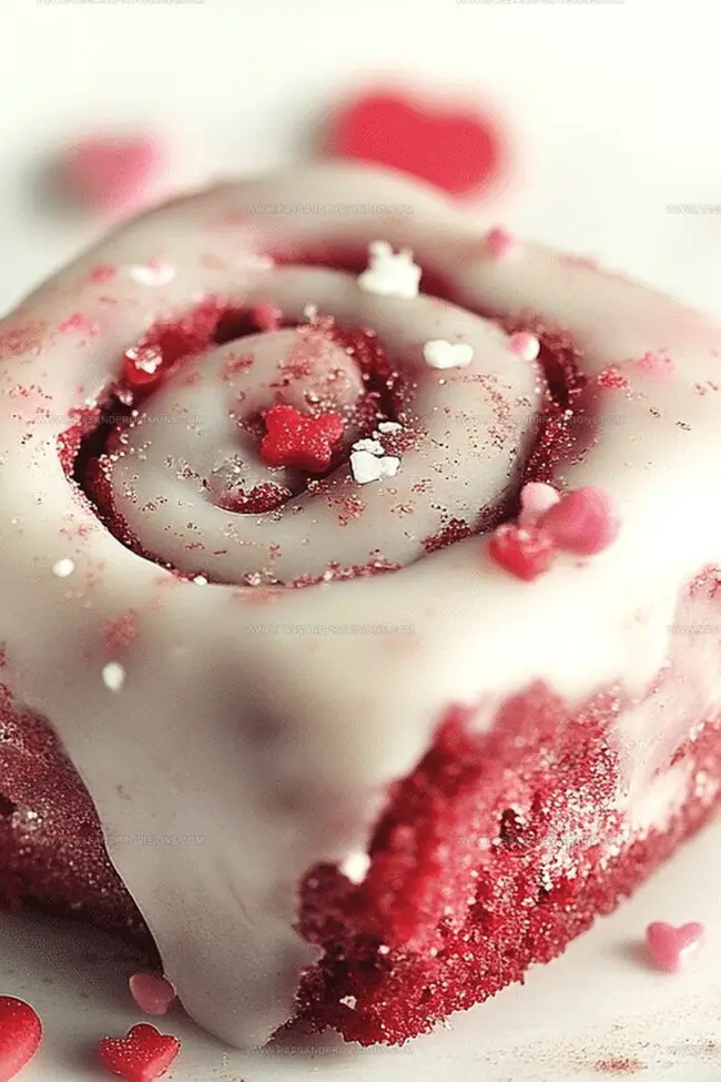 Sweet whispers of romance dance through this delectable red velvet valentines cinnamon rolls that promise to steal hearts.