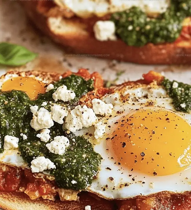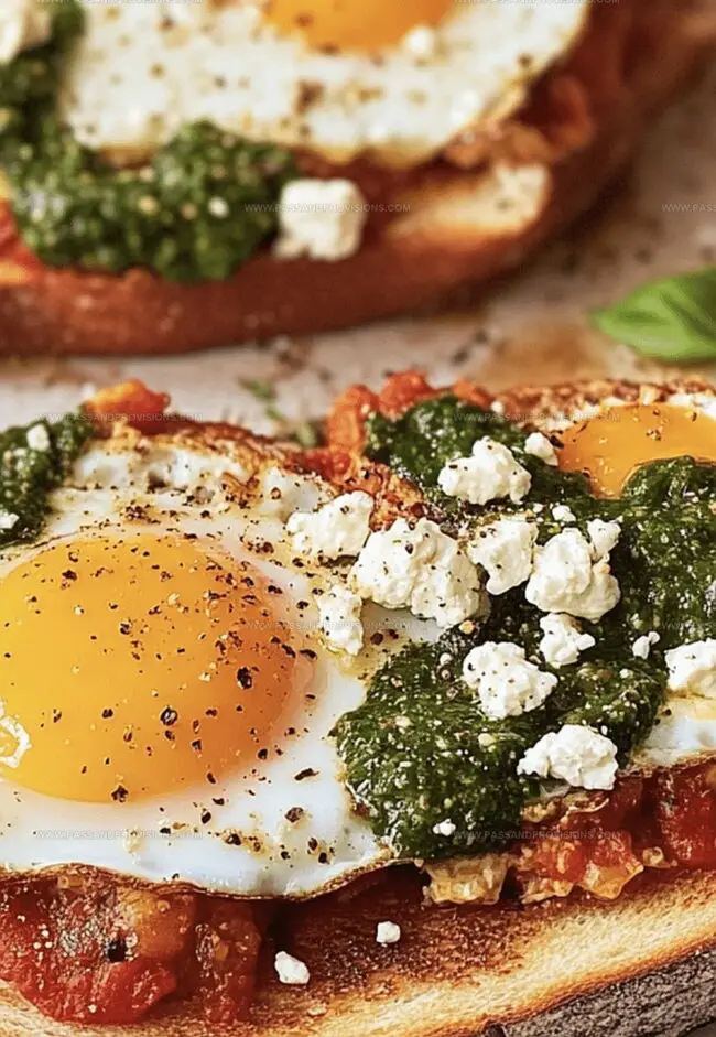 Spoon warm tomato sauce over toasted bread. Crown each slice with a cheesy fried egg. Finish with:Serve immediately and enjoy your flavor explosion!
