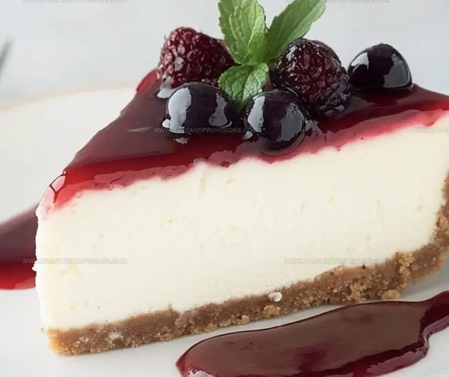 Garnish and Serve: Before presenting, adorn the chilled cheesecake with a vibrant selection of fresh fruits or a decadent sauce, transforming the dessert into a visually stunning and delectable treat ready to be enjoyed.