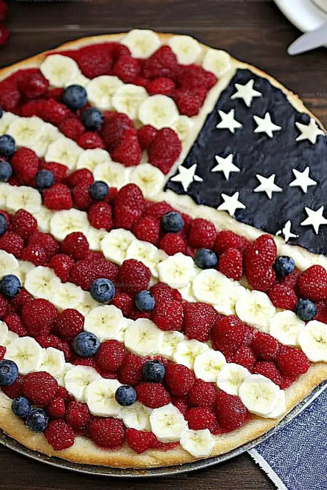 Summer barbecues come alive with this stunning stars and stripes fruit pizza that blends creamy sweetness and patriotic flair.