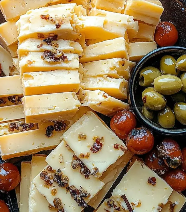Savory “Marinated Cheddar Cheese” brings Mediterranean charm to classic dairy delight. Sharp cheddar cubes swim in aromatic herb-infused olive oil, promising richness and complex flavor for cheese enthusiasts craving bold culinary experiences.