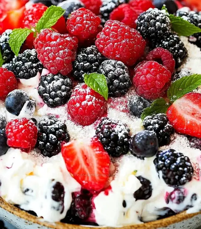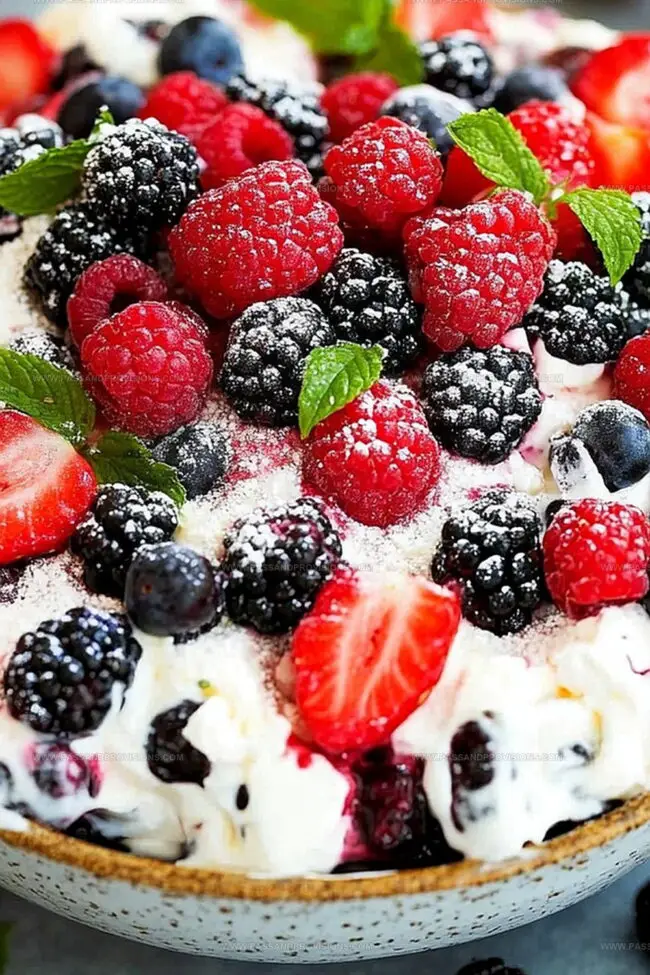 - Harmonious Fusion: Tenderly incorporate strawberries, blueberries, raspberries, blackberries, and optional marshmallows into the creamy base. Gently fold ingredients to maintain the delicate structure and prevent berry bruising.