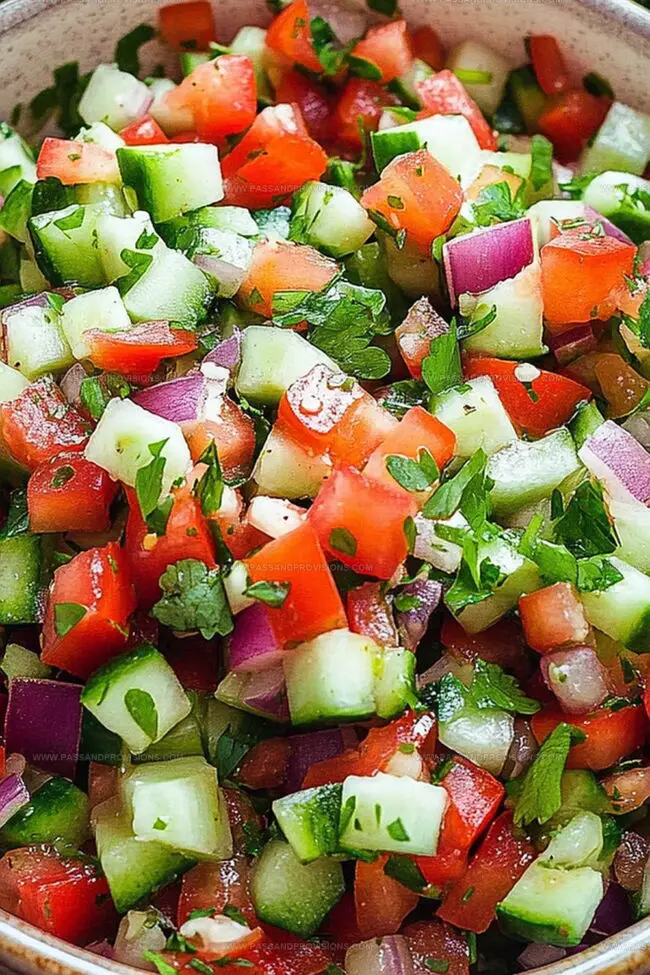 Mediterranean magic unfolds in this refreshing salad, blending crisp cucumbers, juicy tomatoes, and tangy feta with zesty herbs. Fragrant olive oil and lemon dressing elevate each bite, promising a delightful journey through Mediterranean coastal flavors you’ll savor.