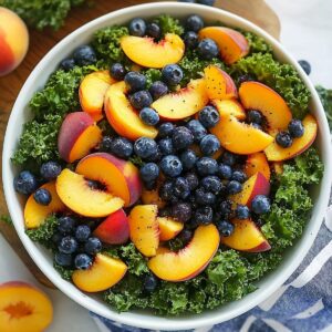 Crisp kale leaves create the perfect base for juicy, ripe peaches and plump blueberries.